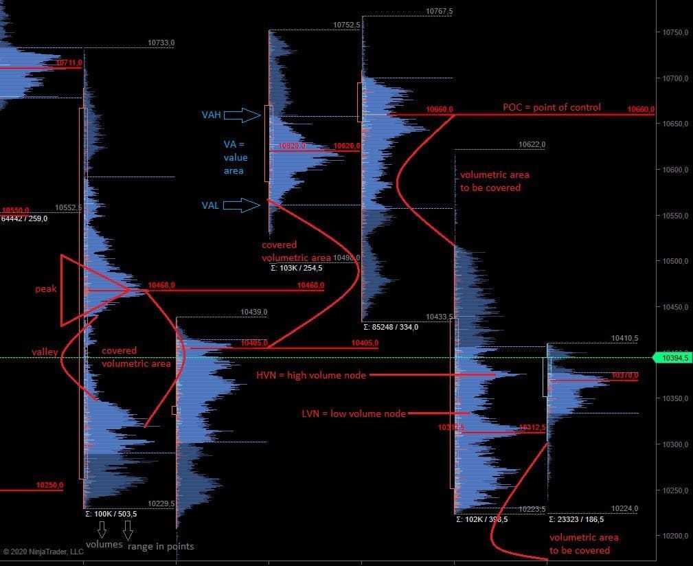 Esempio di profilo del volume giornaliero — Nel grafico Volume Profile trovi un pò di esempi di cose da osservare e una legenda con i nomi dei pattern e dei livelli tecnici.