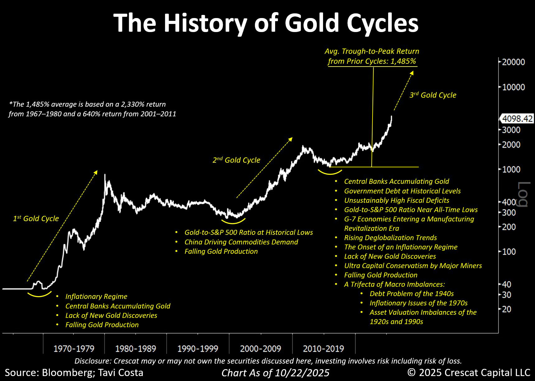 After taking 12 years to double from $1,000 to $2,000, gold doubled again in just five years, recently surpassing $4,000. Transition from $3,000 to $4,000 took just 200 days, and the jump to $4,400 took only 60. Now back to $4,000. What’s next?