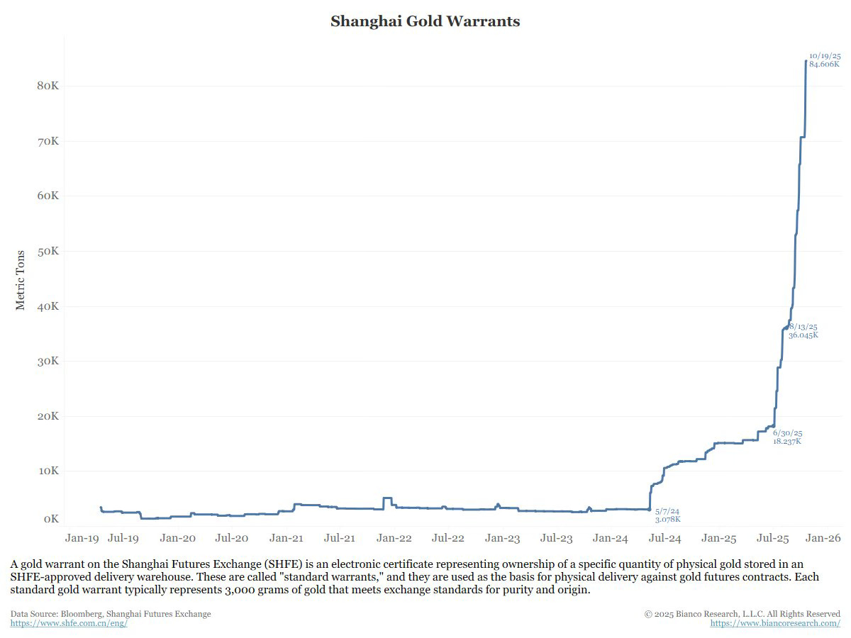 Il quinto grafico è quello che più di tutti descrive la profondità del cambiamento. Mostra l’esplosione verticale dei Shanghai Gold Warrants, i certificati digitali che rappresentano proprietà di oro fisico custodito presso la Shanghai Futures Exchange. I warrant sull’oro di Shanghai stanno aumentando a causa di una combinazione di domanda record di beni rifugio, robusti acquisti di oro da parte delle banche centrali (in particolare da parte della Banca popolare cinese, ndr) e un’intensa volatilità dei prezzi che stimola l’attività degli investitori e l’arbitraggio. Dietro questi numeri si cela la nascita di un nuovo mercato dell’oro reale, basato sul possesso tangibile e non su contratti derivati. La Cina sta di fatto costruendo la sua versione del sistema di clearing aurifero, alternativa a quello londinese. E questo non è un dettaglio tecnico: è la premessa per una nuova infrastruttura monetaria, in cui la fiducia non è più delegata ma garantita dal metallo stesso.