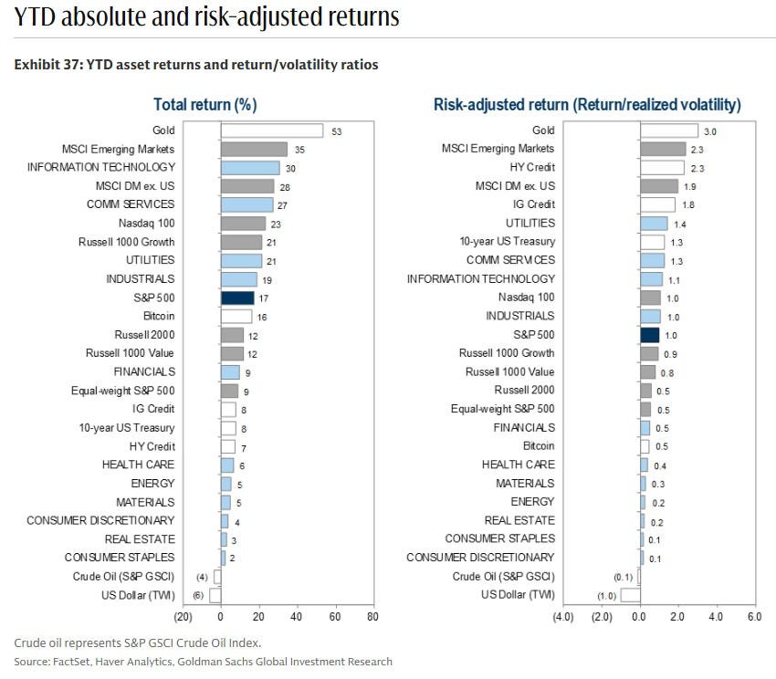 Il sesto grafico mostra un dato tanto sorprendente quanto inequivocabile: nel 2025, l’oro è stato l’asset con la migliore performance assoluta e il miglior rendimento corretto per il rischio tra tutte le principali classi di investimento globali. Con un total return del 53% da inizio anno, l’oro ha superato nettamente l’azionario americano, i mercati emergenti e persino il settore tecnologico, che pure aveva dominato l’ultimo decennio. Ancora più significativo è l’indicatore di rendimento aggiustato per la volatilità (return/realized volatility): con un valore di 3.0, l’oro si colloca ben al di sopra di tutti gli altri asset, segnalando non solo forza direzionale, ma anche stabilità del movimento. Questa dinamica è ancor più interessante se si considera che i rendimenti obbligazionari si sono mossi in territorio incerto, il dollaro ha perso terreno e le borse occidentali hanno iniziato a mostrare segni di saturazione.