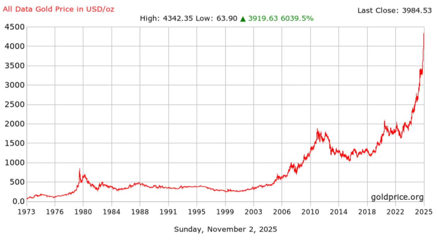 Dopo aver impiegato dodici anni per raddoppiare da 1.000 a 2.000 dollari, l’oro ha raddoppiato nuovamente in soli cinque anni, superando recentemente i 4.000 dollari. Il passaggio da 3.000 a 4.000 dollari ha richiesto appena duecento giorni, e il salto a 4.400 dollari solo sessanta. Ora di nuovo a 4.000. What’s next?