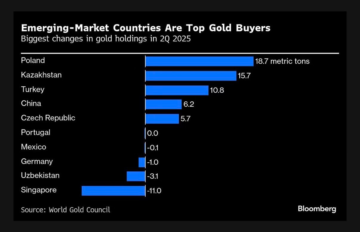 The third chart shows a lesser-known but highly significant phenomenon: transfer of physical gold from Western warehouses to emerging markets. For decades, London was the nerve center of the global gold market, the place that set prices and held reserves, but in recent years centrality has been eroding. A growing proportion of the gold registered in London is being withdrawn and transferred to Poland, Kazakhstan, Turkey, and China (more on this later, ed.), where demand is real, not financial. This shift is not only logistical: it is symbolic. It represents the shift in the global economic center of gravity from a system based on derivatives and futures to one based on physical delivery and actual ownership. In other words, gold is returning to where it is considered a value, not a hedge.