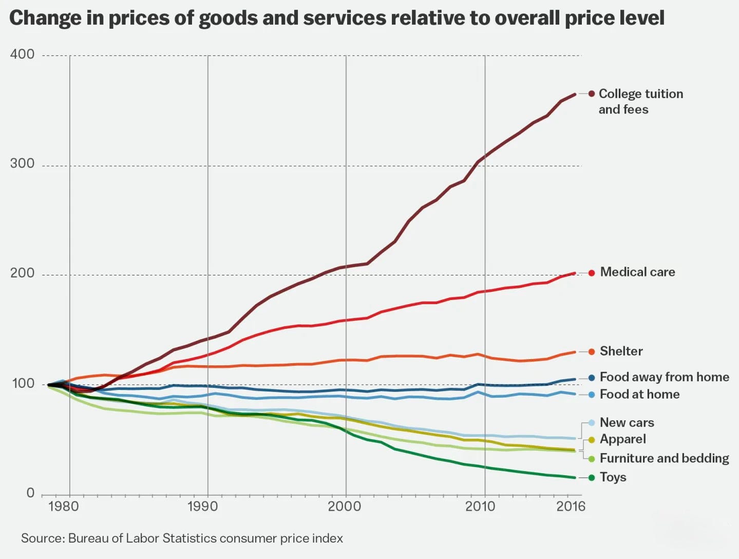 Quando la produttività di un settore aumenta, i salari di quel settore aumentano naturalmente. Questo costringe i salari e i prezzi dei servizi che non hanno una maggiore produttività ad aumentare per rimanere competitivi. Così, quando un Paese diventa più ricco, i beni diventano più economici, ma i servizi ad alta intensità di lavoro, come l'assistenza sanitaria e le rette universitarie, costano di più.