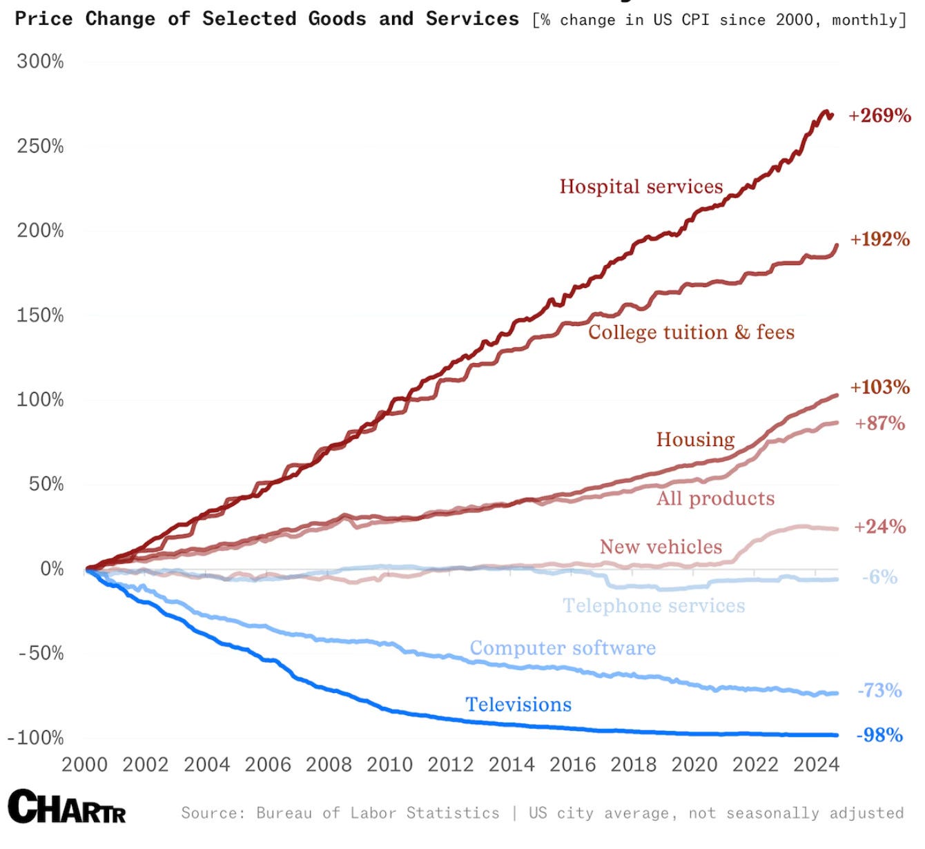 This mechanism has been called Baumol's cost disease, and he himself sensed its scope far beyond the arts sector. According to this theory, in a context of rapid technological development, we should expect a decline in prices for industrial goods, such as cars, telephones, clothing or fruit, and a concomitant rise in prices for services that require a lot of human labor, such as schooling, health care, child care, haircuts, personal training, legal assistance and so on. And this trend is exactly what economic statistics have confirmed. Over the decades, health care and education have soared in cost, while the price of cars, clothes, furniture, toys and other industrially produced goods has remained under control or even fallen relative to inflation: exactly as Baumol predicted half a century earlier.