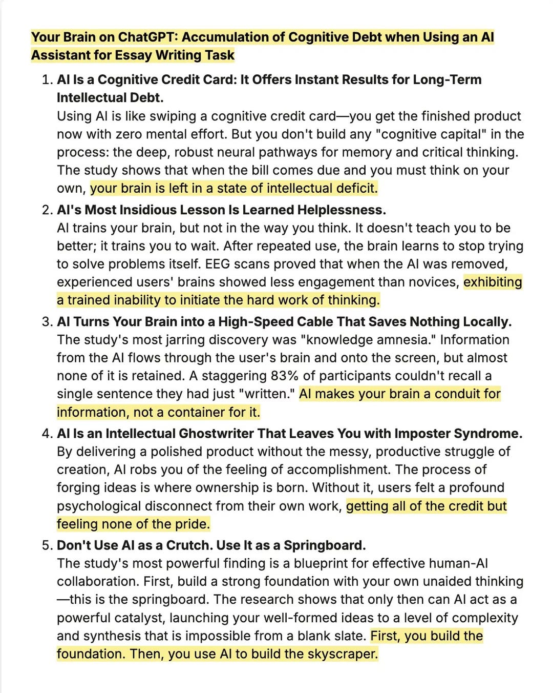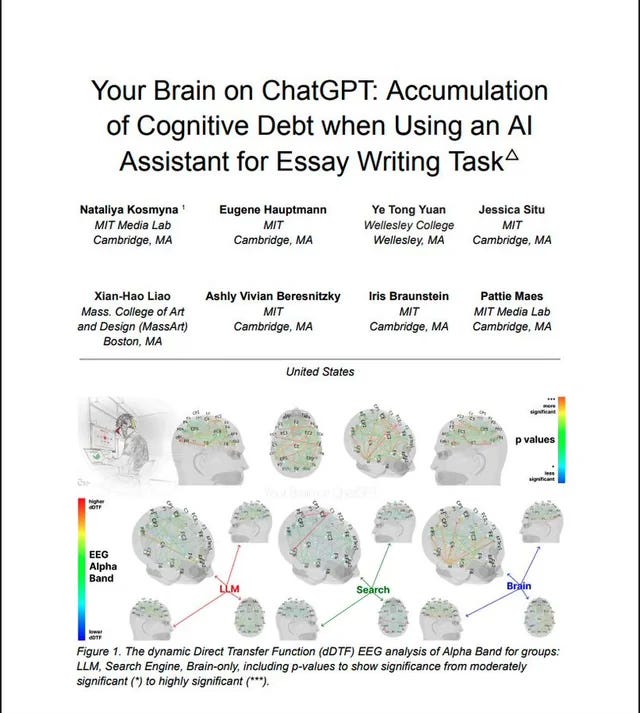 Artificial Intelligence is a cognitive credit card that offers immediate results in exchange for long-term intellectual debt. But in this process, no capital is built up, no historical memory can develop deep and robust neural pathways for critical thinking. The study shows when it comes time to pay the bill and you have to think for yourself, your brain finds itself in a state of intellectual deficit.