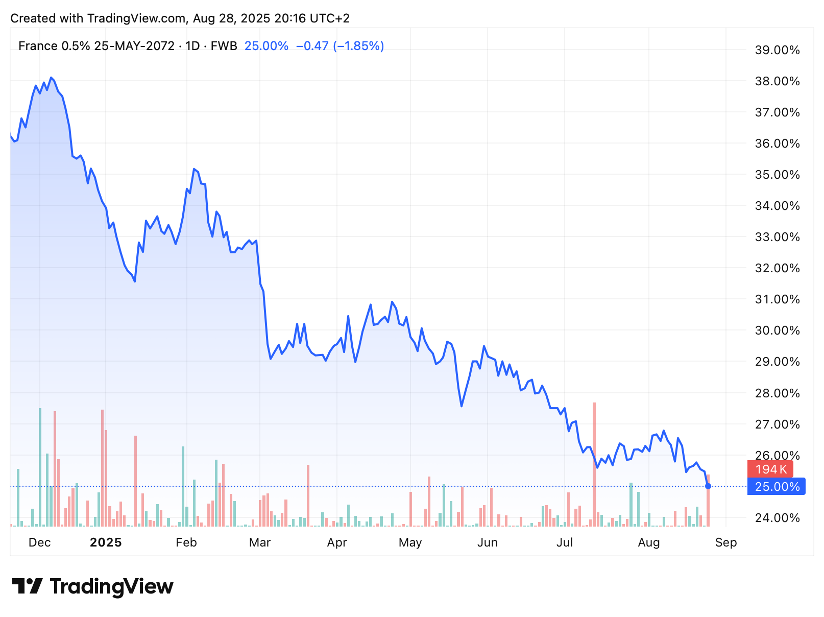 In a context already fraught with political and economic uncertainty, one figure more than any other illustrates the depth of crisis of confidence that France is currently experiencing. OAT maturing in 2072 (ISIN: FR0014001NN), considered for years to be one of the most solid sovereign bonds in the world, is now trading below 25. In just a few years, it has lost around 75% of its value. A devaluation of this magnitude is unusual for a core Eurozone country with France's credit profile. We are not talking about an emerging issuer in difficulty, but the second largest economy in the EU. Yet the price of OATs tells a story of growing mistrust, of risk premiums that until recently would have seemed unthinkable.