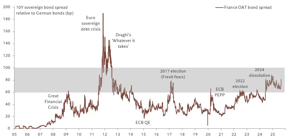 Investors are watching with growing concern. French assets reacted badly to the announcement of the confidence vote: stock index lost more than 2% in a few hours and spread between French OATs and German Bunds rose to its highest level since the last election. This is not an isolated phenomenon: the entire Eurozone is experiencing a nervous autumn, aided by the end of ECB's monetary easing cycle and quantitative tightening, which is pushing yields higher. But France stands out for its worsening perceived risk. Political tensions and difficulties in fiscal consolidation make it a special case for rating agencies and large funds.