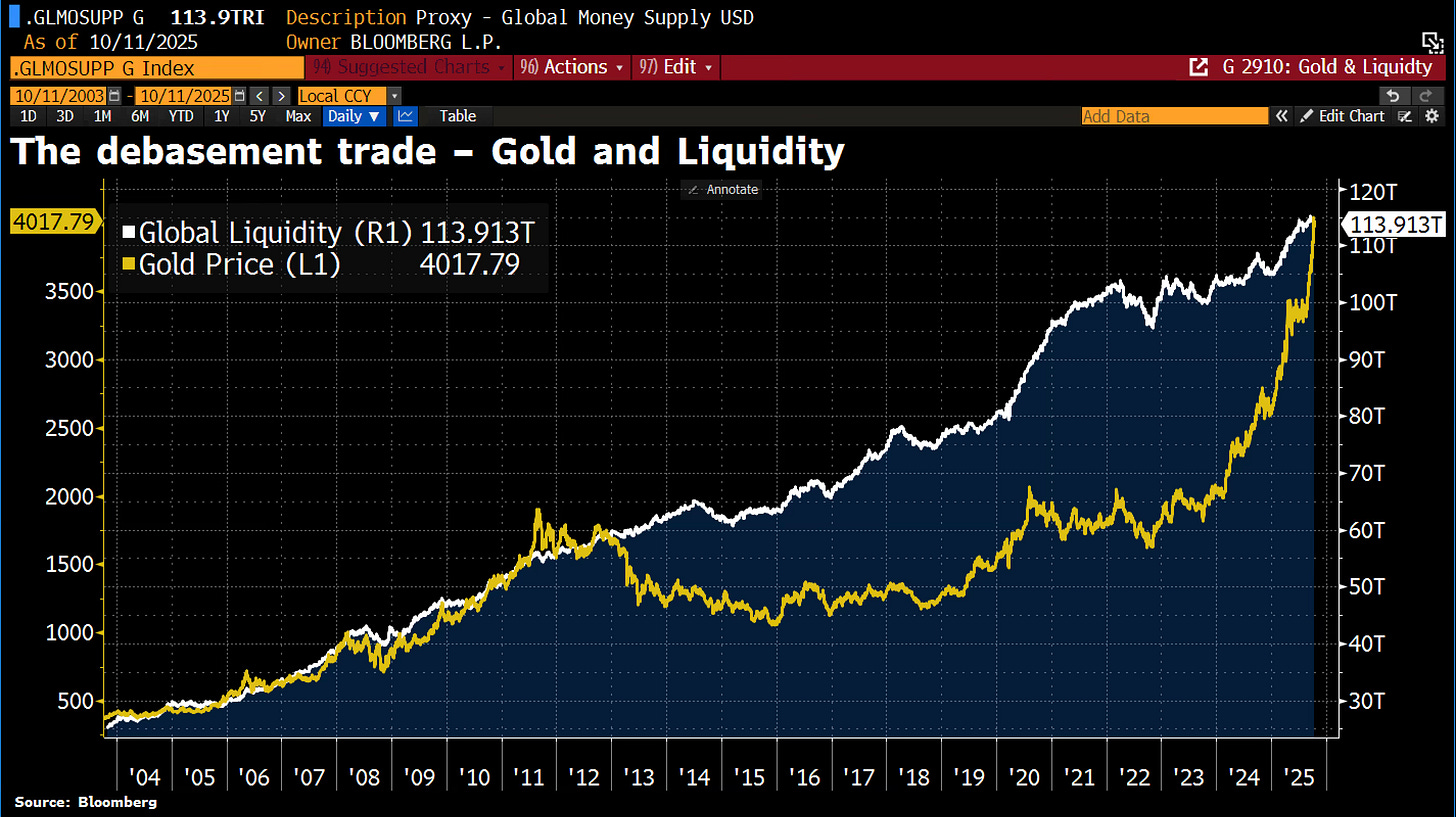 From 2020 to 2022, the coordinated monetary and fiscal response to Covid flooded the world with liquidity. The balance sheets of the major central banks (Federal Reserve, ECB, Bank of Japan, and People’s Bank of China, ed.) reached record levels, exceeding a total of $30 trillion. A few years later, much of that liquidity remains in the system, and the markets have benefited massively: global equities have gained over 100% from their pandemic lows, bonds have found a new equilibrium after 2022, and even alternative asset classes (gold, bitcoin, private markets) have ballooned thanks to the hunger for yield.