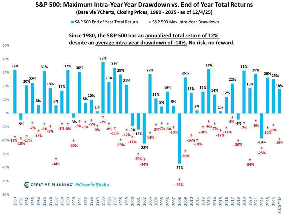 La volatilità è enorme nel breve, ma si smorza sul lungo termine. Se guardiamo dal 1950 al 2025 scopriamo che i drawdown annuali medi dell’S&P500 sono stati di circa -13,7%, mentre il rendimento medio annuale è stato di +11,3% nello stesso arco di tempo. Ci sono stati anni disastrosi come il 2008 dove il drawdown ha superato il -48% e l’anno ha chiuso con un -37% sul totale, oppure nel 1974 con drawdown di quasi -38% e un forte ribasso di periodo. Eppure questi ribassi vengono sistematicamente compensati nel medio-lungo periodo: dopo i crolli del 2008 o della pandemia, la ripresa ha portato a decine di percentuali di guadagno cumulato nei decenni successivi. Questo significa che la volatilità è una caratteristica stabile dei mercati, ma non inficia la tendenza di fondo: i mercati finanziari crescono nel tempo.